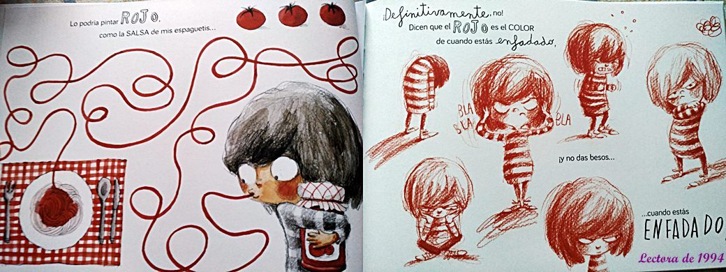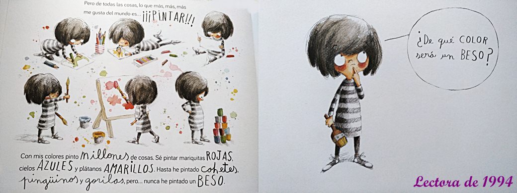 Minimoni quiere pintar un beso, pero no sabe de qué color es, así que se plantea los diferentes colores que le podrían ir bien.